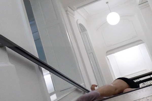 compliment each other in an almost mocking manner. What seems to be a child's game of drawing shapes around human limbs, transitions into a motive of surveillance. The bodies, seemingly in a free fall, are suddenly in a horizontal position and thus become one with the surroundings.