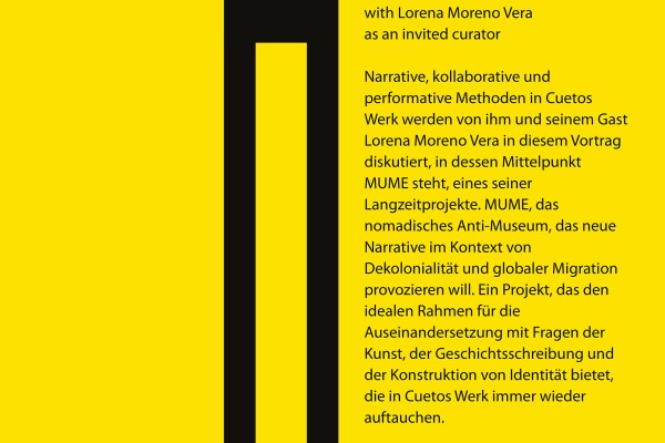 Narrative, kollaborative und performative Methoden in Cuetos Werk werden von ihm und seinem Gast Lorena Moreno Vera in diesem Vortrag diskutiert, in dessen Mittelpunkt MUME steht, eines seiner Langzeitprojekte. MUME, das nomadisches Anti-Museum, das neue Narrative im Kontext von Dekolonialität und globaler Migration provozieren will. Ein Projekt, das den idealen Rahmen für die Auseinandersetzung mit Fragen der Kunst, der Geschichtsschreibung und der Konstruktion von Identität bietet, die in Cuetos Werk immer wieder auftauchen.